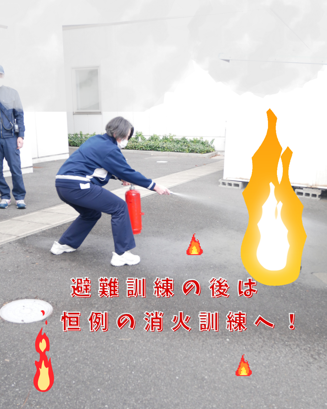 避難訓練の後は、消火訓練も併せて行います。緊急事態発生時に、落ち着いた行動がとれるよう、消火器の扱い方など再確認しました。